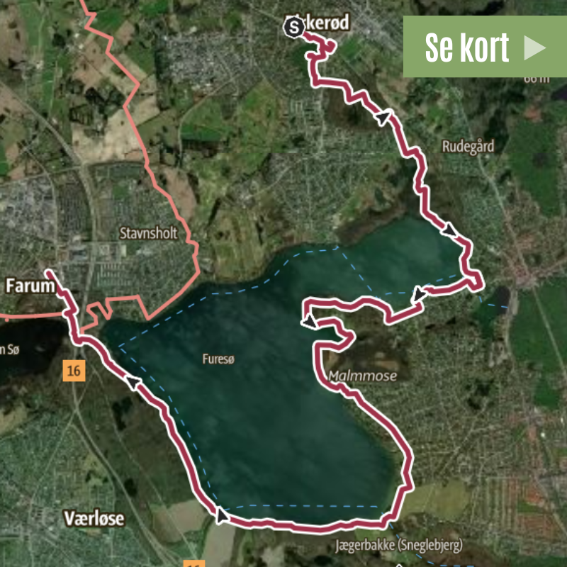20 km vandretur med start ved Birkerød station og slut ved Farum station. Ruten går primært langs Furesøen, men I får også korte stræk ved 3 andre søer – nemlig Birkerød sø, Olsens sø i Vaserne og Farum sø.